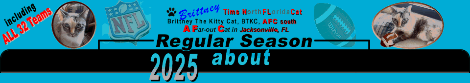 This website was originally designed for my kitty cat, Brittney, when she was a kitten. Things change - this cute little kitten grew up to be a "Big Cat". We're (me and my cat) are from Jacksonville, FL, and with a way more than casual interest in the Jacksonville Jaguars, I incorporated the Jaguars schedule in to the website, since (among other reasons) the Jacksonville Jaguars are also known as the "Big Cats". Well, my brother lives in Nashville and I have an old radio buddy who also lives in Nashville, so I included the Tennessee Titans schedule also. Well it got to looking pretty good, so I just included all of the NFL team schedules, and then it just kind'a got away from me and landed up being a pretty full featured NFL tracking website, starring my cat, Brittney, in North FL, hence the site name "TimsCat.com" and then click on the . |