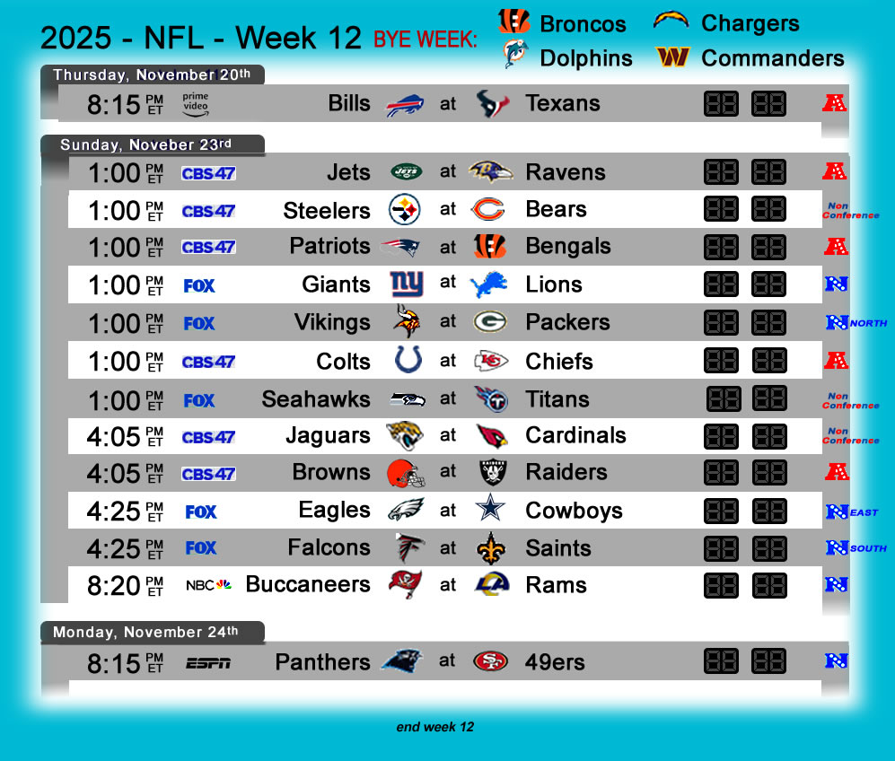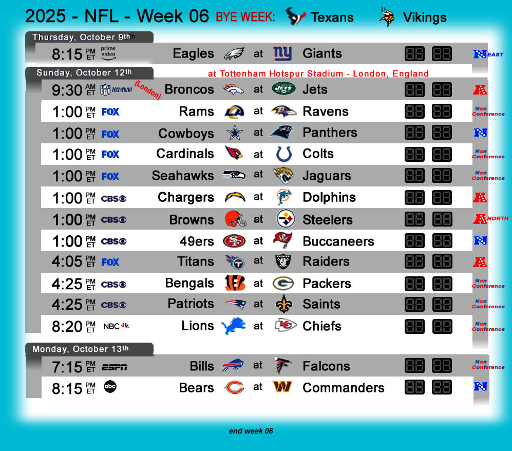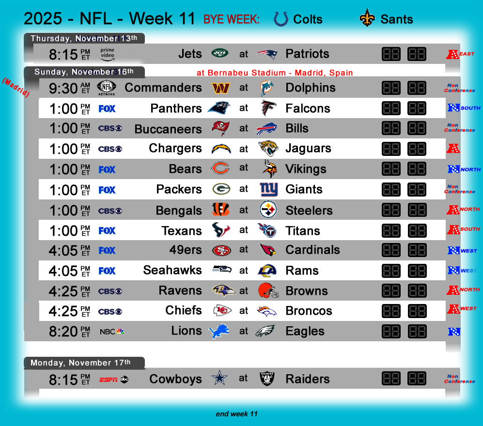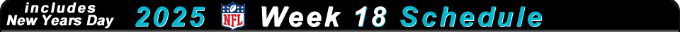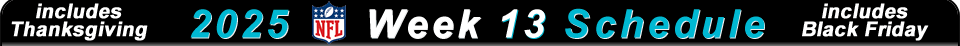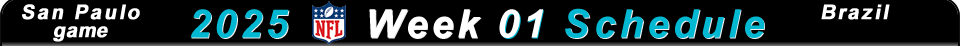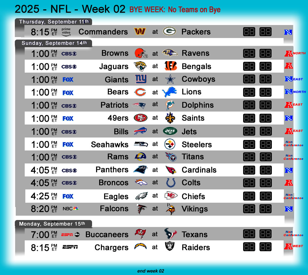 Home Weekly Schedules Team Schedules 2025 Standings Next Game Home Fields Bye weeks About ☰