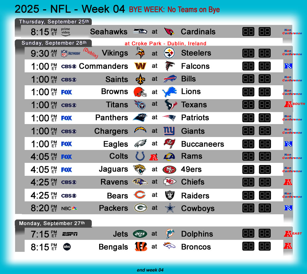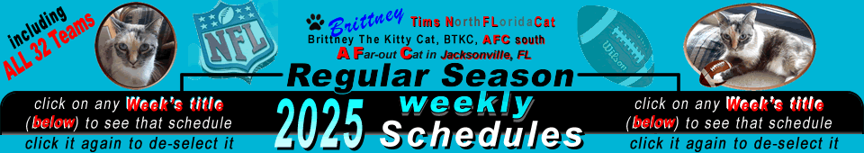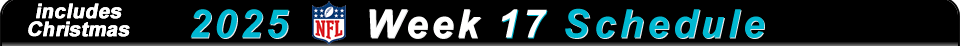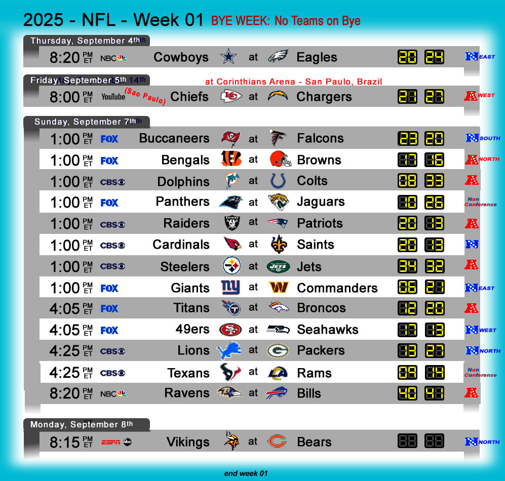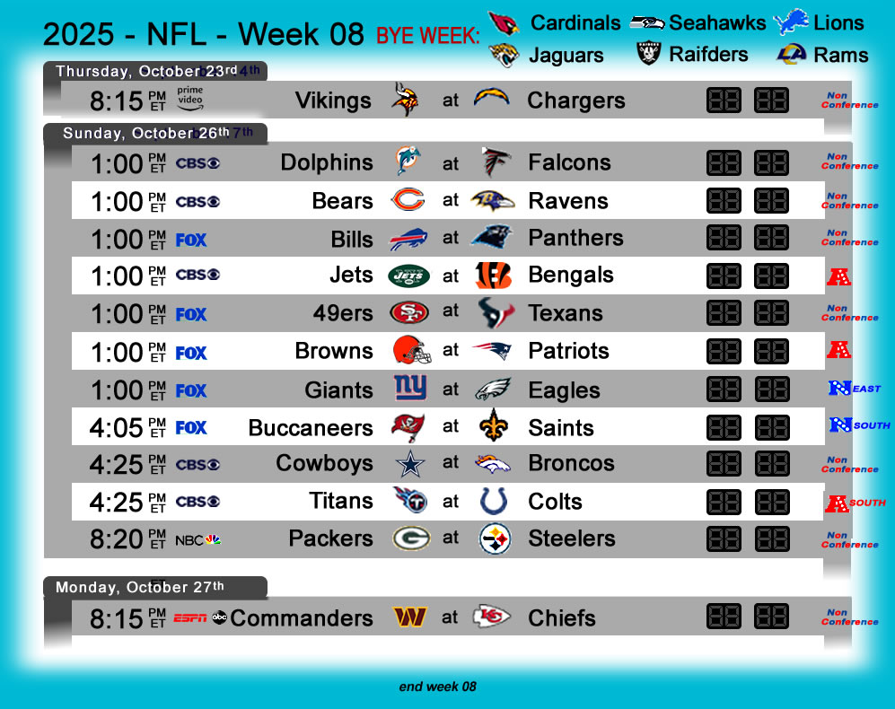 Home Weekly Schedules Team Schedules 2025 Standings Next Game Home Fields Bye weeks About ☰