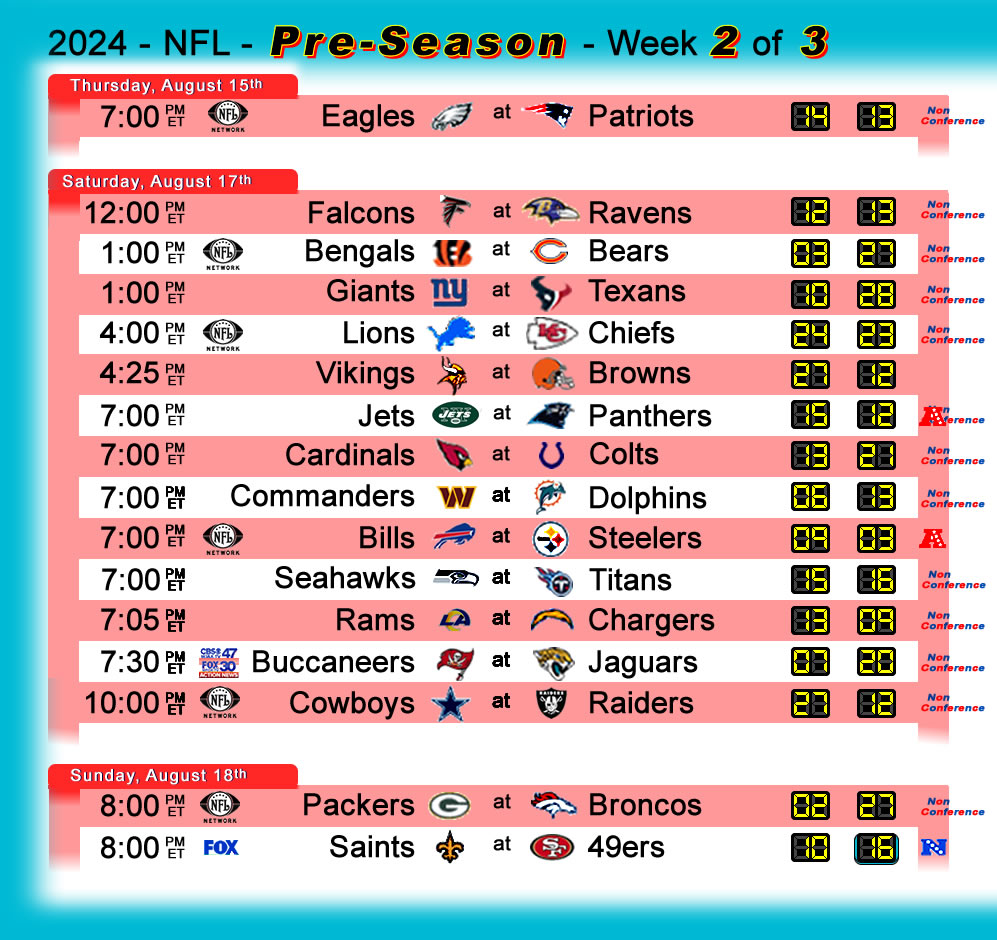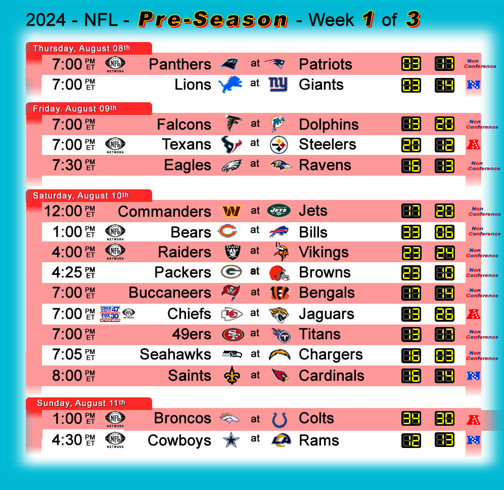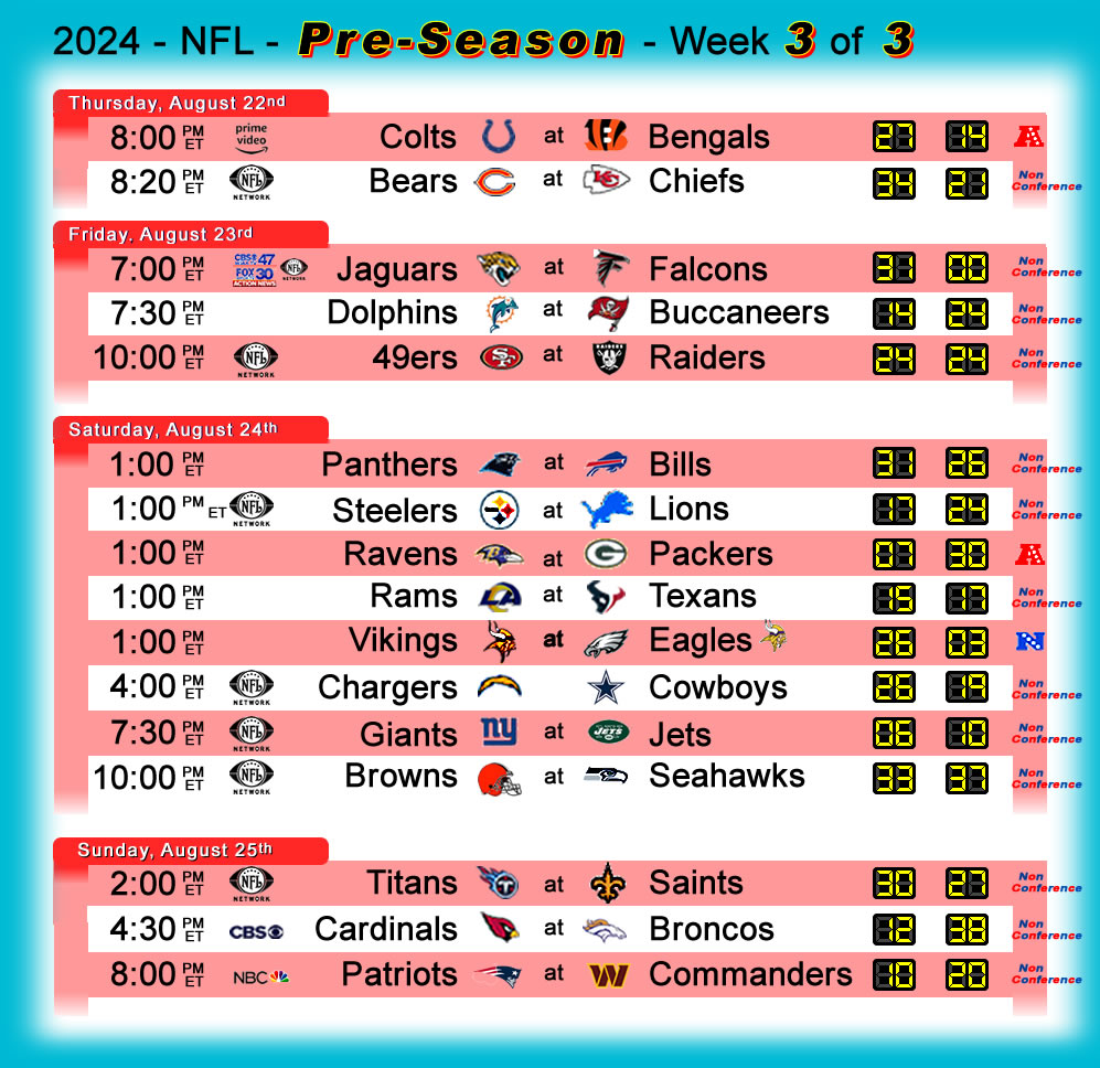 Home Weekly Schedules Team Schedules 2024 Standings Next Game Home Fields Bye weeks About ☰