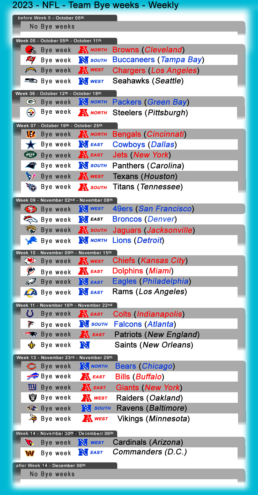 Home Weekly Schedules Team Schedules 2023 Standings Next Game Home Fields Bye weeks About ☰